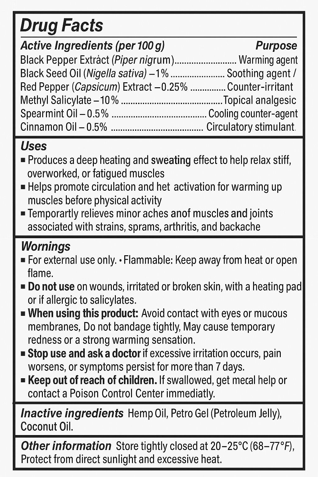 Meanwhile, black seed, spearmint, and cinnamon oils balance the warmth with a cooling, calming finish — delivering complete muscle comfort and recovery.